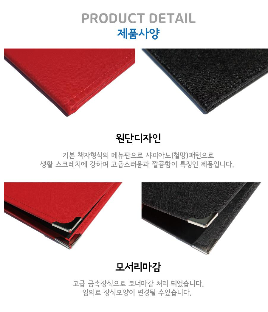실제로 카페나 레스토랑에서 사용해보시면 고급 금속장식으로 처리된 코너 마감이 얼마나 세련된 느낌을 주는지 확실히 체감하실 수 있습니다. 손님들이 메뉴판을 받는 순간 "이 집은 뭔가 다르네"라는 인상을 받게 되어 매장 전체의 품격이 한층 높아지는 효과를 경험하게 됩니다.