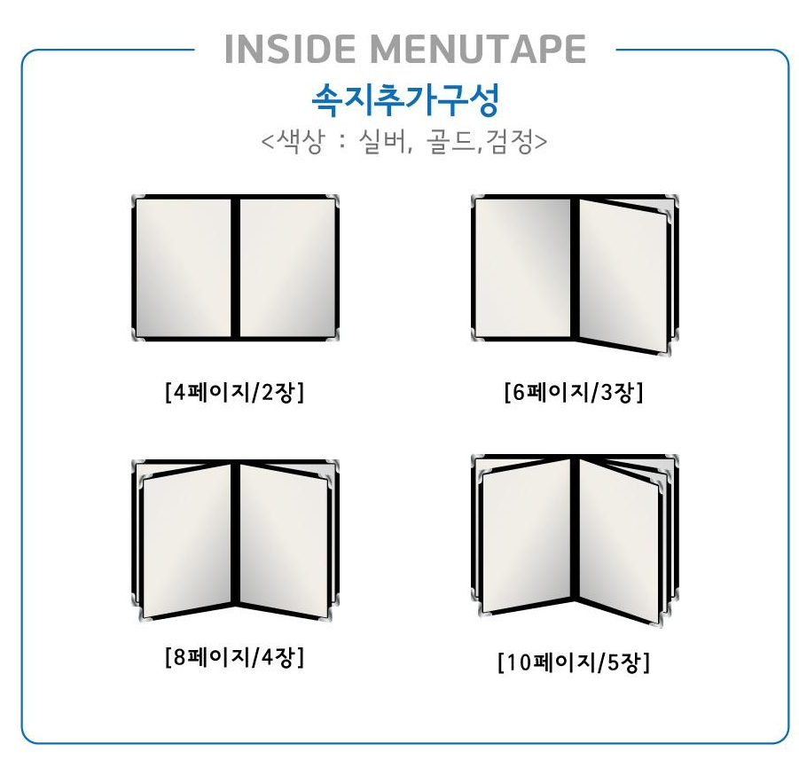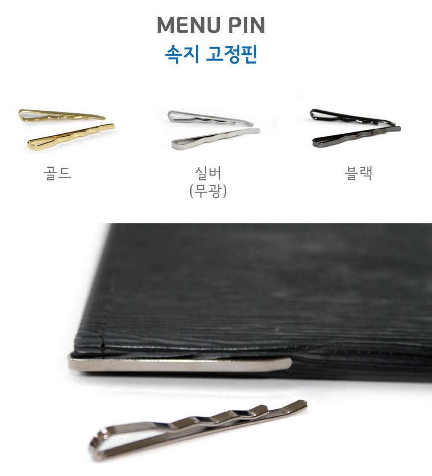 기본 구성으로 제공되는 내부 투명필름 2페이지를 활용하면 앞뒤에 메뉴를 배치할 수 있어 꽤 많은 내용을 담을 수 있습니다. 만약 메뉴가 더 많아서 추가하고 싶다면 최대 10페이지까지 속지를 추가할 수 있어 확장성도 뛰어납니다. 속지 고정핀이 함께 제공되는 것도 큰 장점입니다.