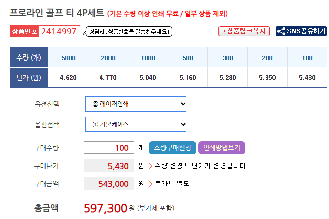 100개 제작 시 개당 5,430원이라는 합리적인 가격으로 고품질의 골프 액세서리를 제작할 수 있으며, 대량 제작 시에는 개당 4,620원까지 가격이 내려가 예산 효율성도 뛰어납니다. 이는 시중에서 판매되는 유사한 기능의 골프 액세서리 대비 상당히 경쟁력 있는 가격입니다.